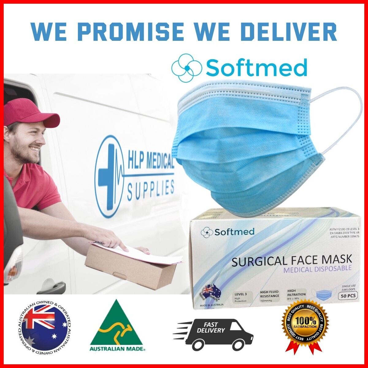Softmed Australian made, Level 3, 3ply Surgical Face Mask (Blue), Pack of 50pcs